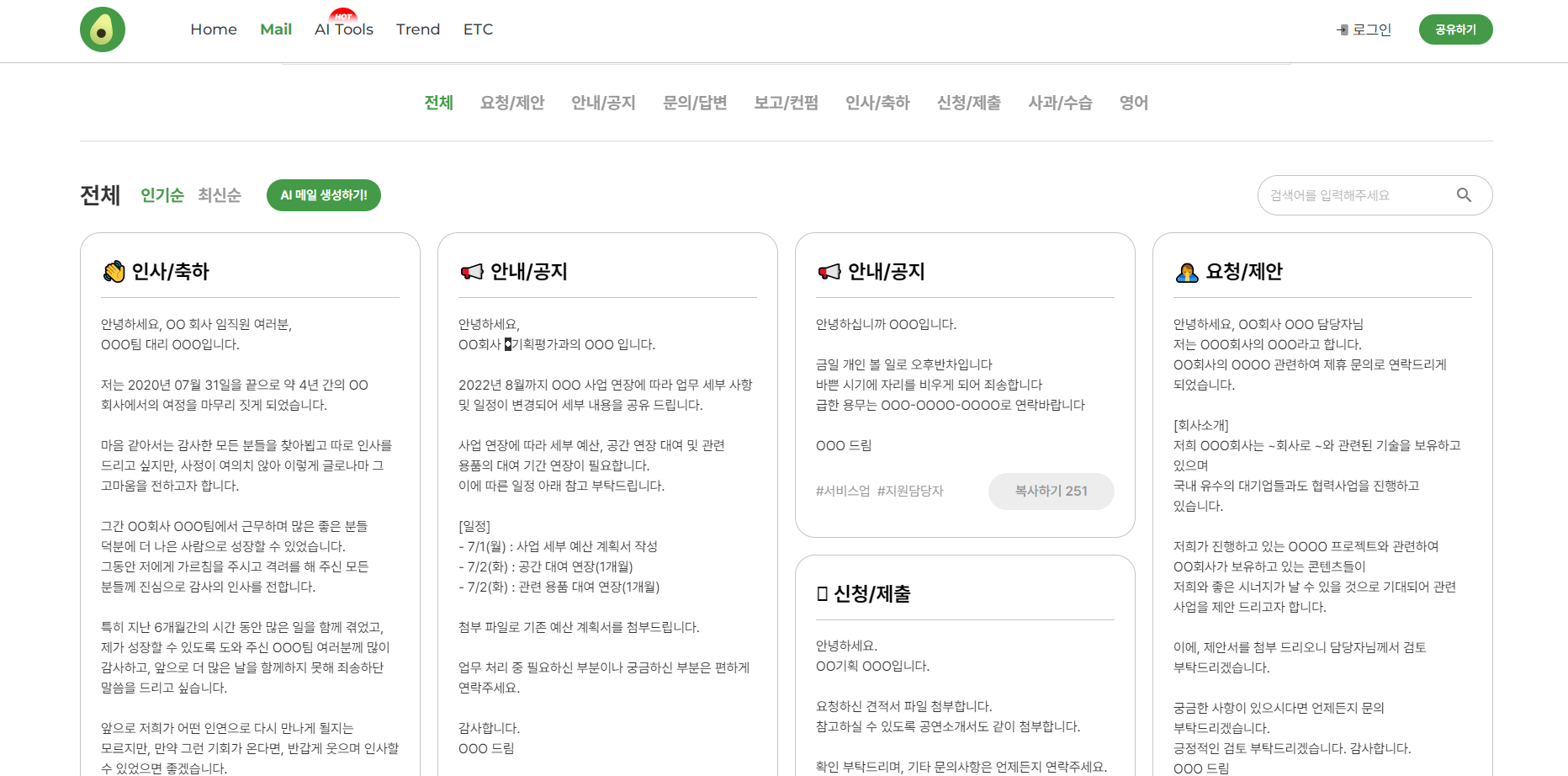 업무 메일 양식 자동 작성 사이트 "아보카도"