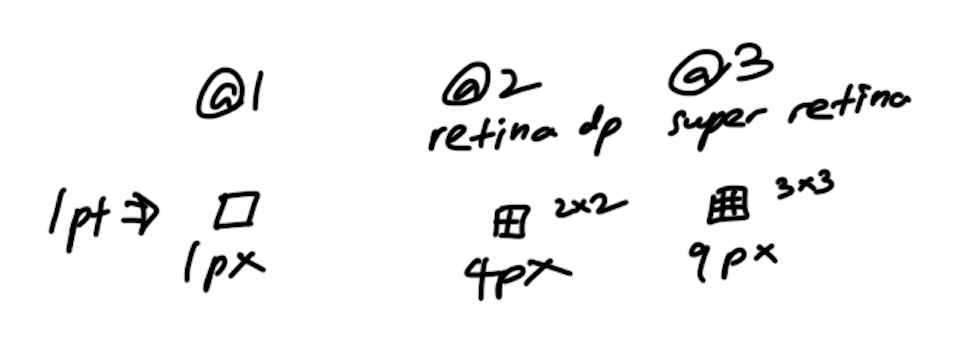 - 1pt가 해상도 (@1, @2, @3)에 따라 1, 4, 9 px로 표현되는 것이다.