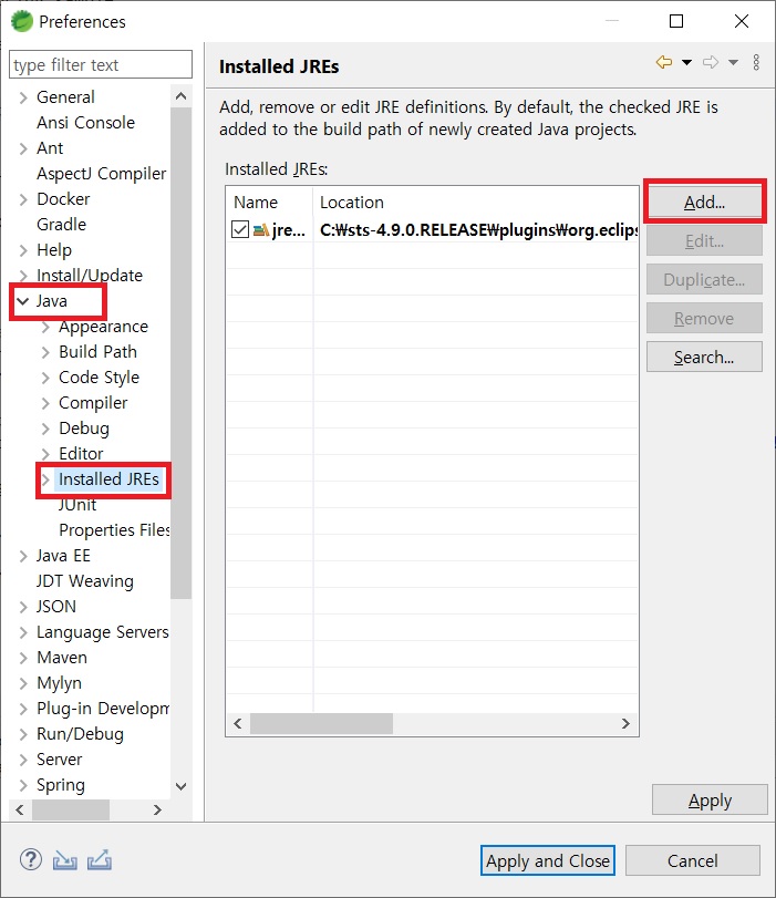 ② "JAVA" → "Installed JREs" 속성창을 보면 STS는 기본적으로 jre를 포함한 것을 확인할 수 있다.