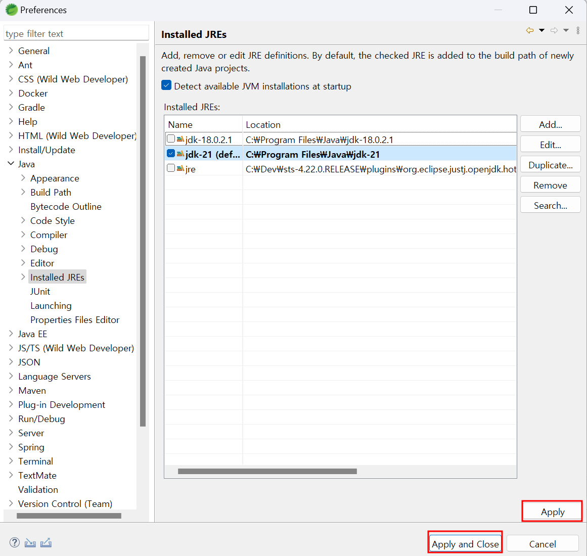 ⑤ 설정한 JDK 폴더를 체크 확인하고, "Apply and Close" 버튼을 클릭한다.