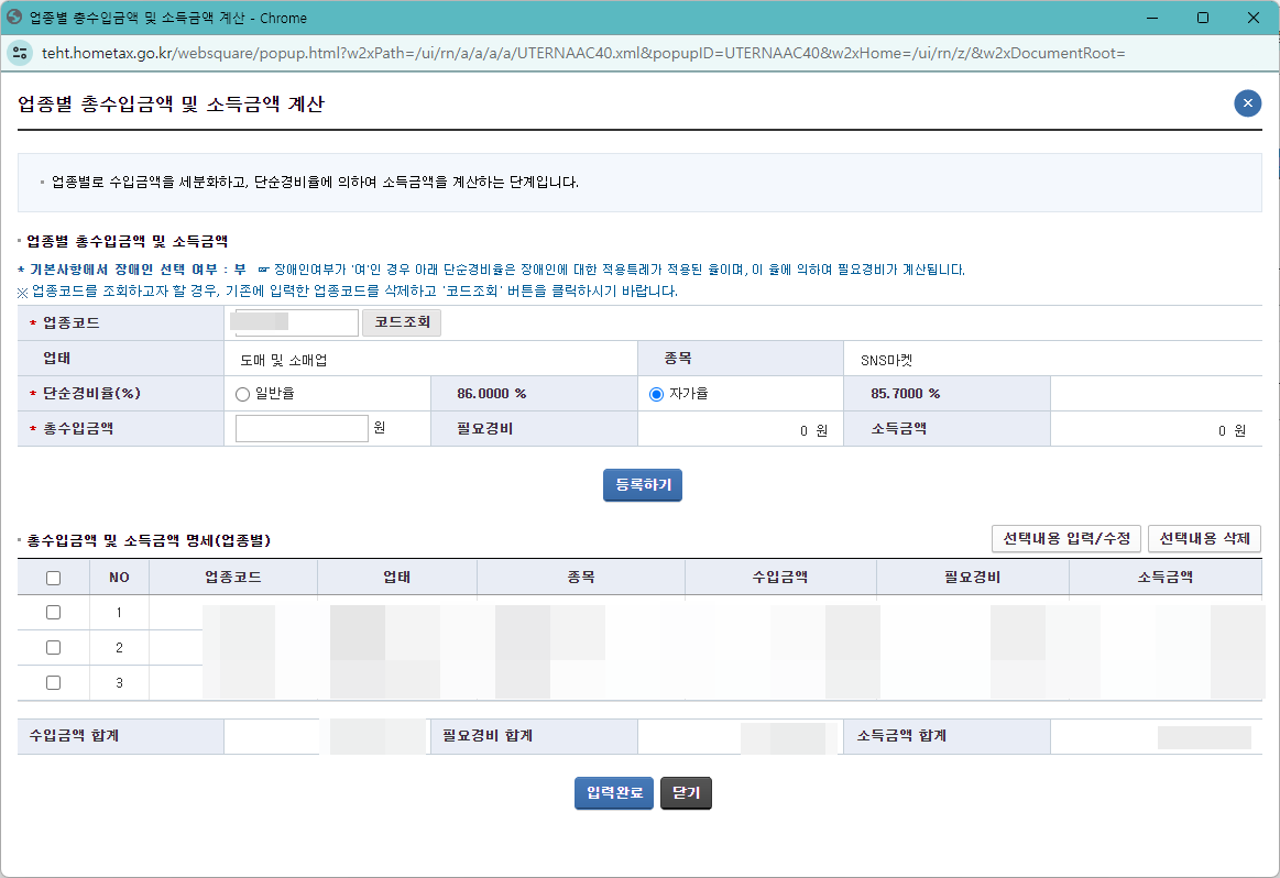 🔎 업종코드를 입력 후 소득 금액을 입력하면 자동으로 계산이 됩니다.