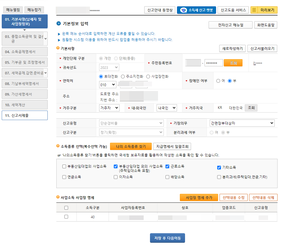 2023년 귀속으로 나에게 발생했던 소득을 모두 체크해준 뒤 [저장 후 다음이동] 합니다.