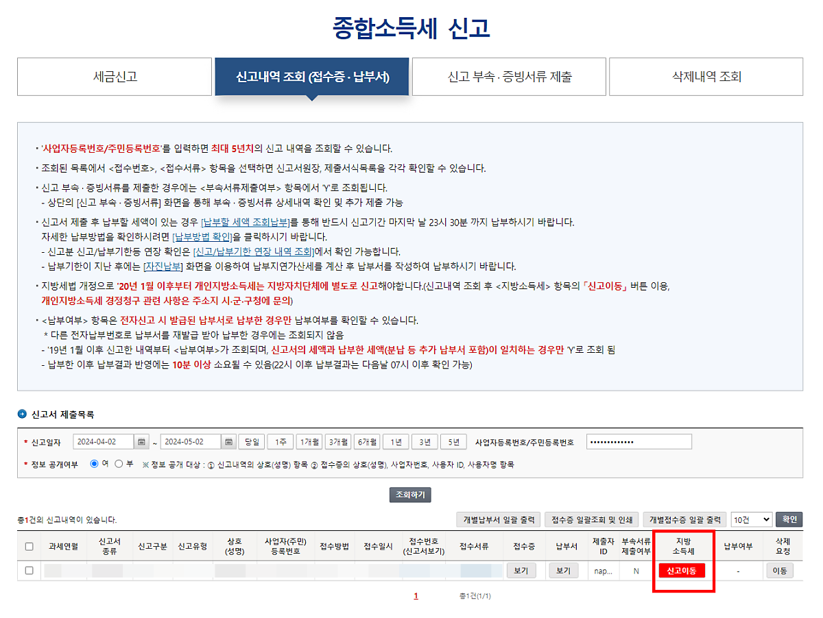 하단에 [지방 소득세 신고이동] 버튼이 뜹니다.