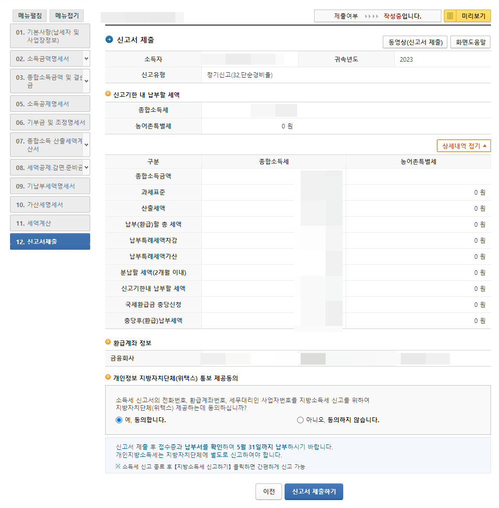 종합소득세 신고를 마치고 [신고내역 조회] 를 해보시면