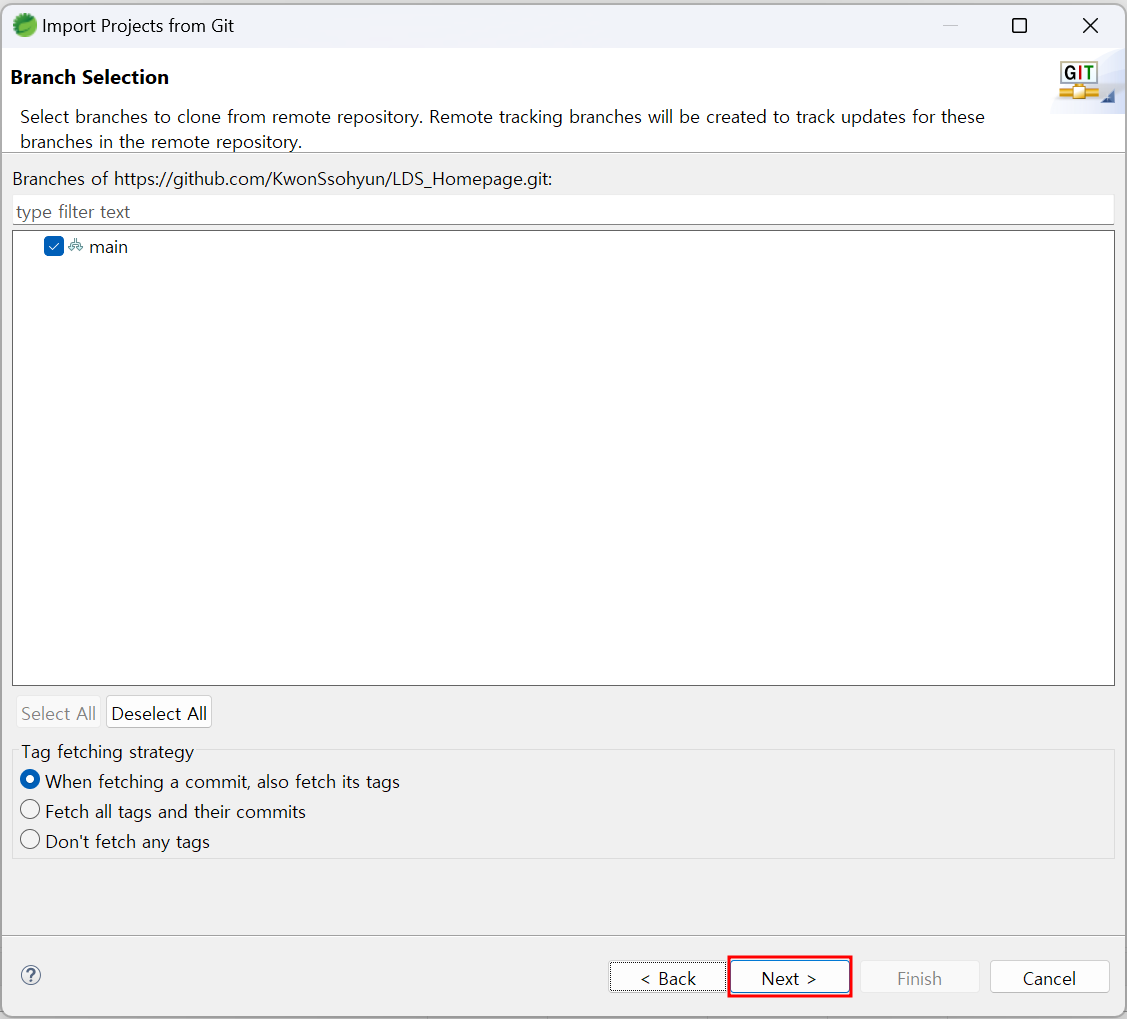 연결할 branch선택 화면이 나타납니다. 선택 후 Next 버튼 클릭