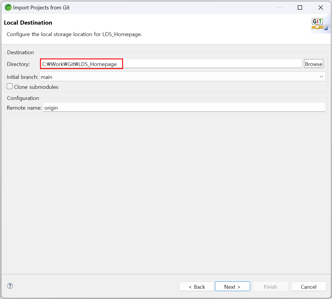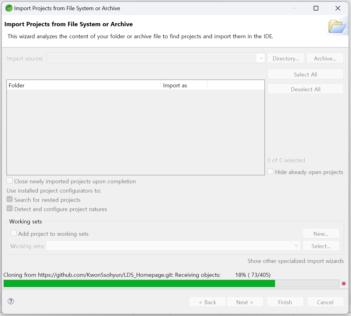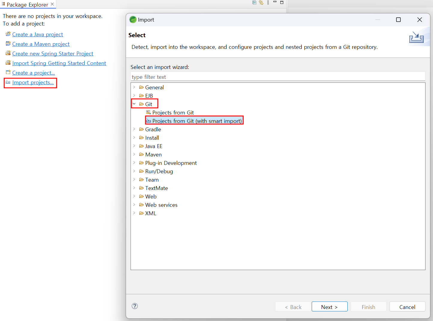 - 메뉴 -> file > import > git > project from git(with smart import)선택