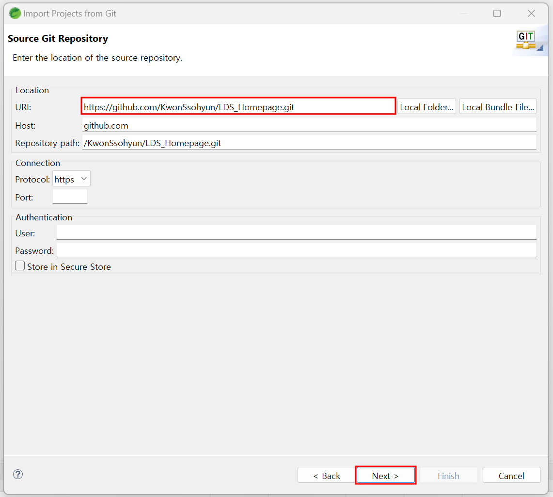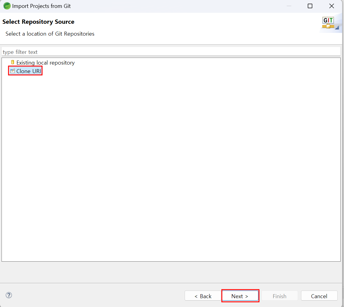 2. Clone URI 선택 ▶ Next 선택