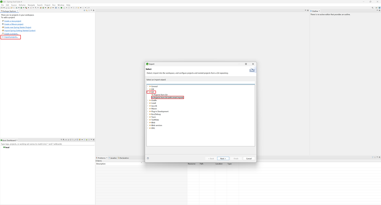 프로젝트를 STS에서 깃 클론 해서 다시 가져오는 방법이 깔끔하다.
