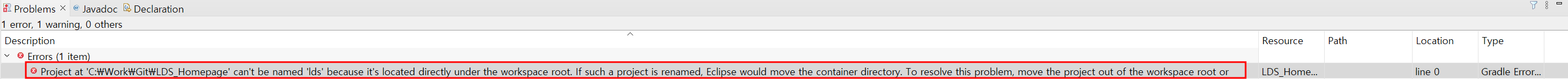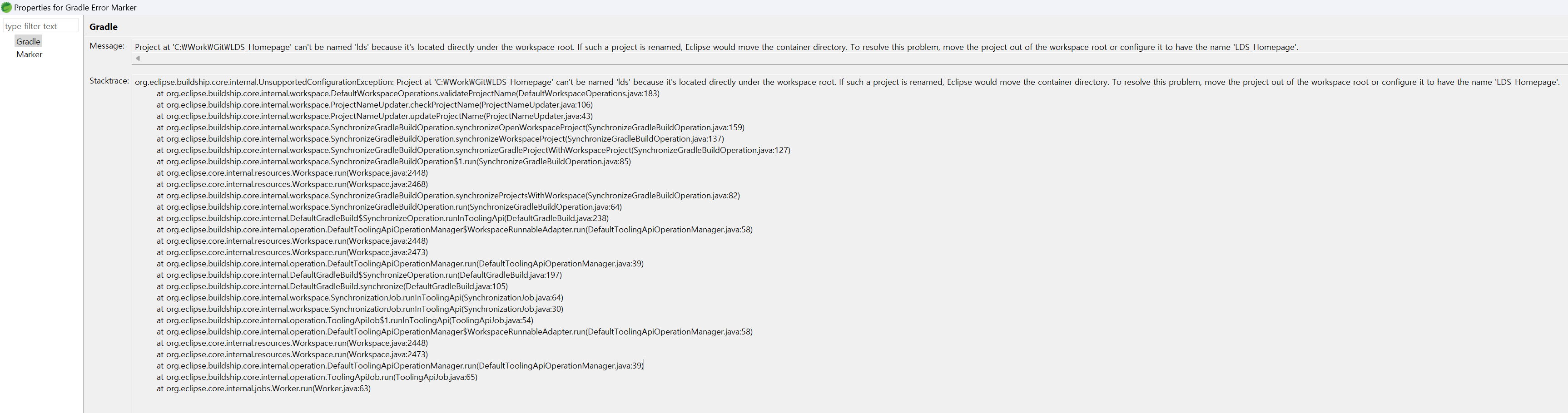org.eclipse.buildship.core.internal.UnsupportedConfigurationException: Project at 'C:\Work\Git\LDS_Homepage' can't be named 'lds' because it's located directly under the workspace root. If such a project is renamed, Eclipse would move the container directory. To resolve this problem, move the project out of the workspace root or configure it to have the name 'LDS_Homepage'.