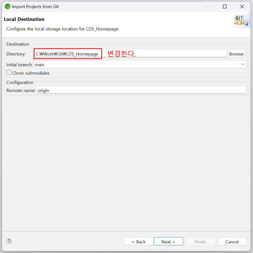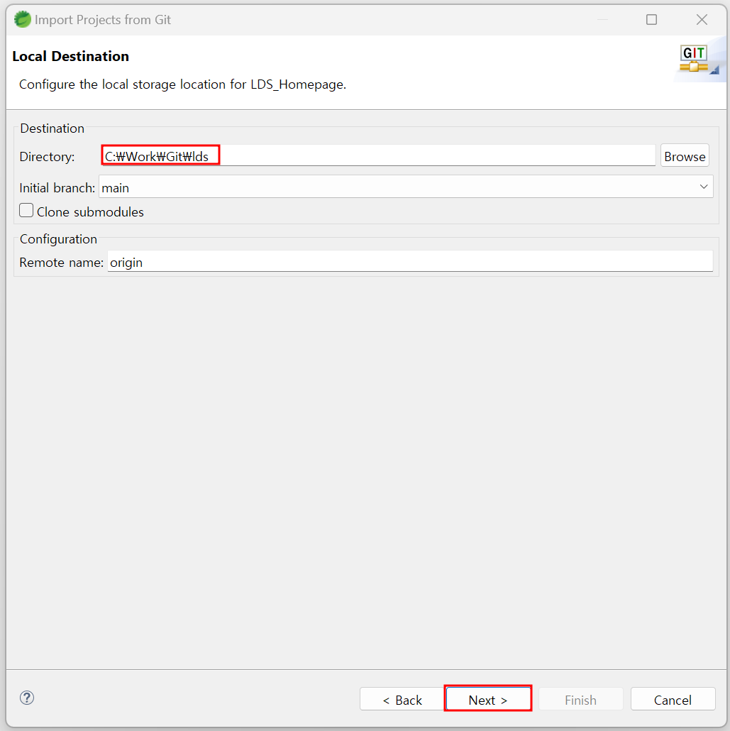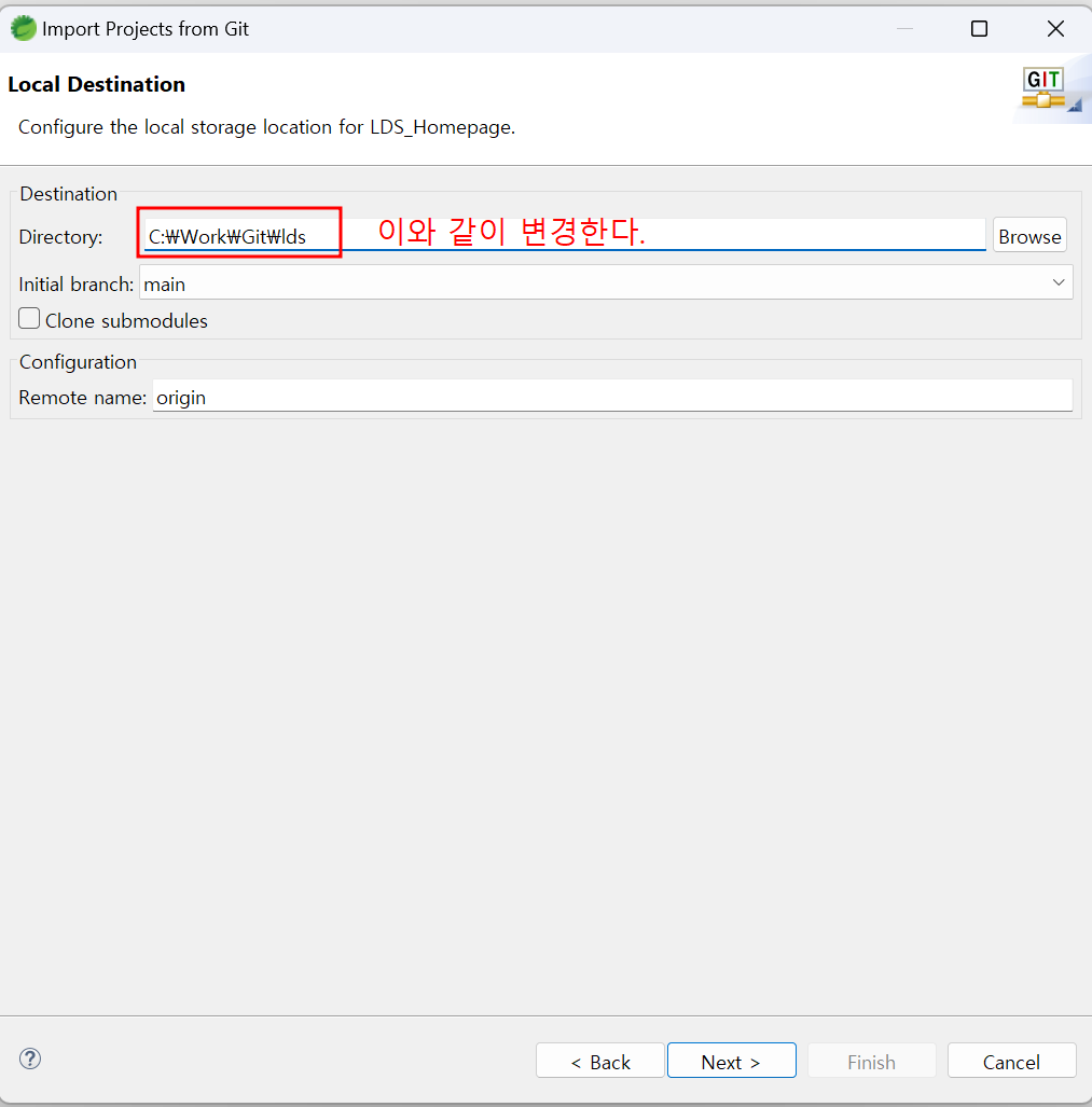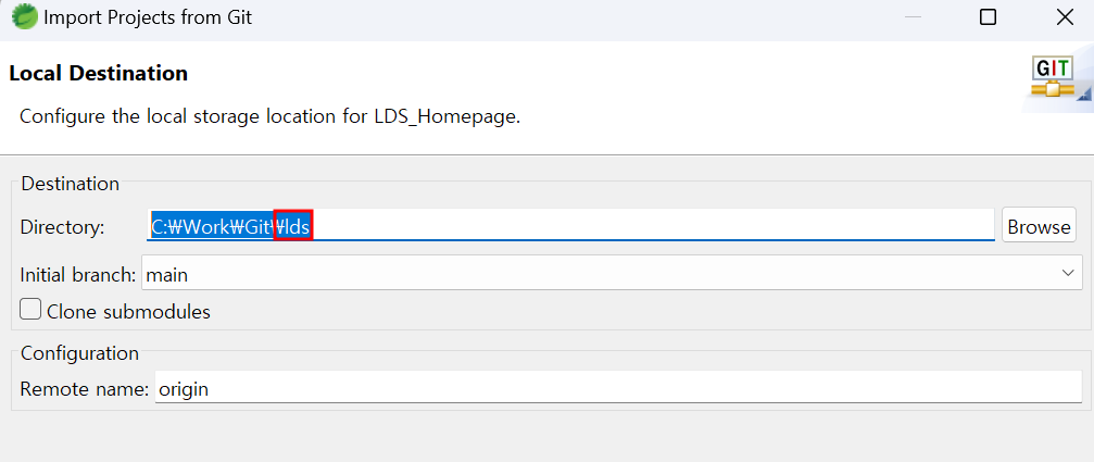 C:\Work\Git\lds ▶ lds 로 폴더명 동일하게 맞춘다.