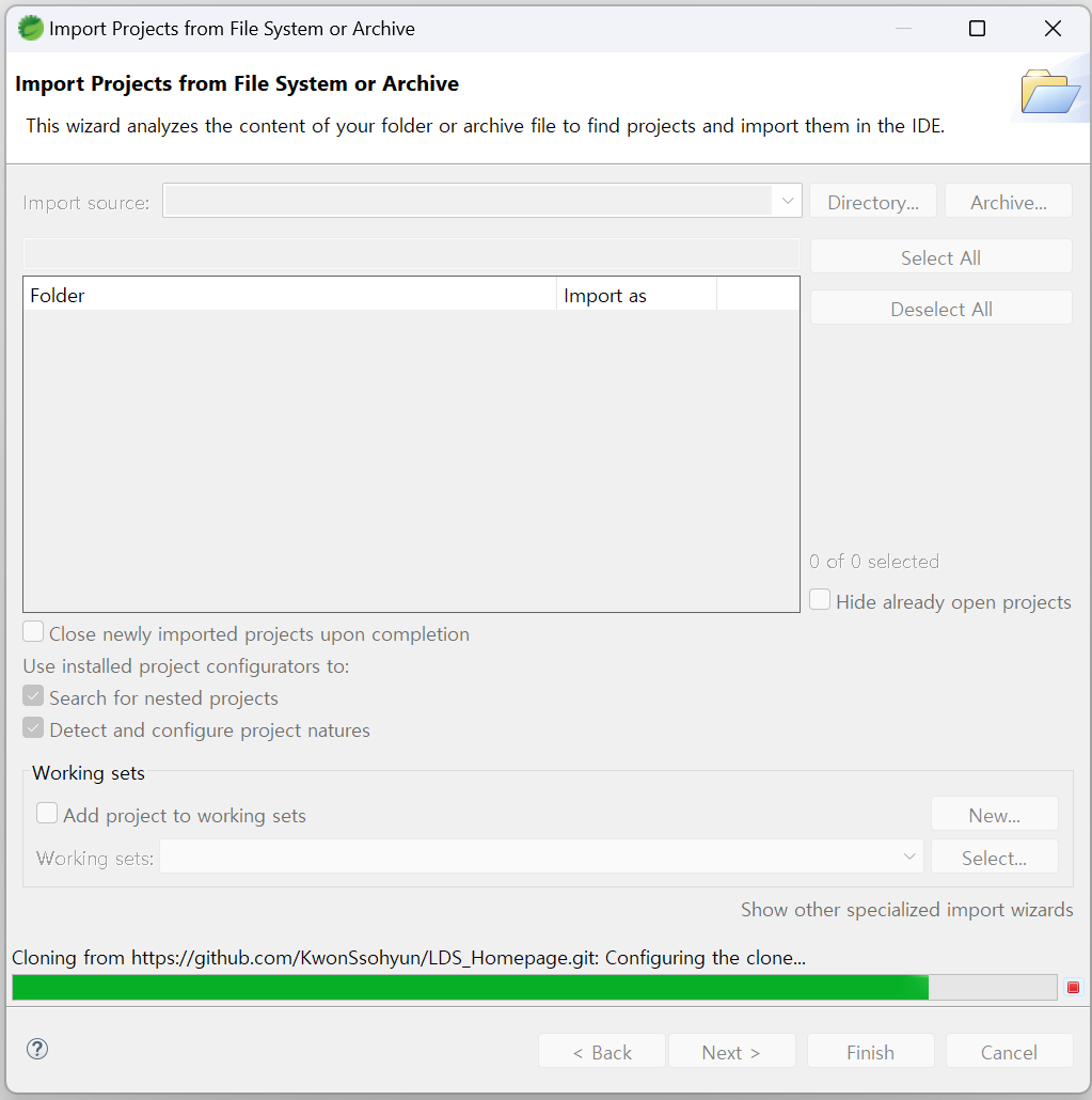소스를 다운받는 프로그래스바가 생성된 이후 모두 받고 완료 ▶ Finish 버튼 클릭