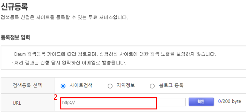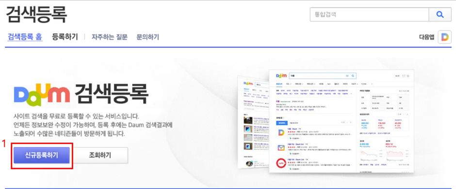 Daum 검색등록 사이트 검색을 무료로 등록할 수 있는 서비스입니다. 언제든 정보보완 수정이 가능하며, 등록 후에는 Daum 검색결과에 노출되어 수많은 네티즌들이 방문하게 됩니다. 신규등록하기