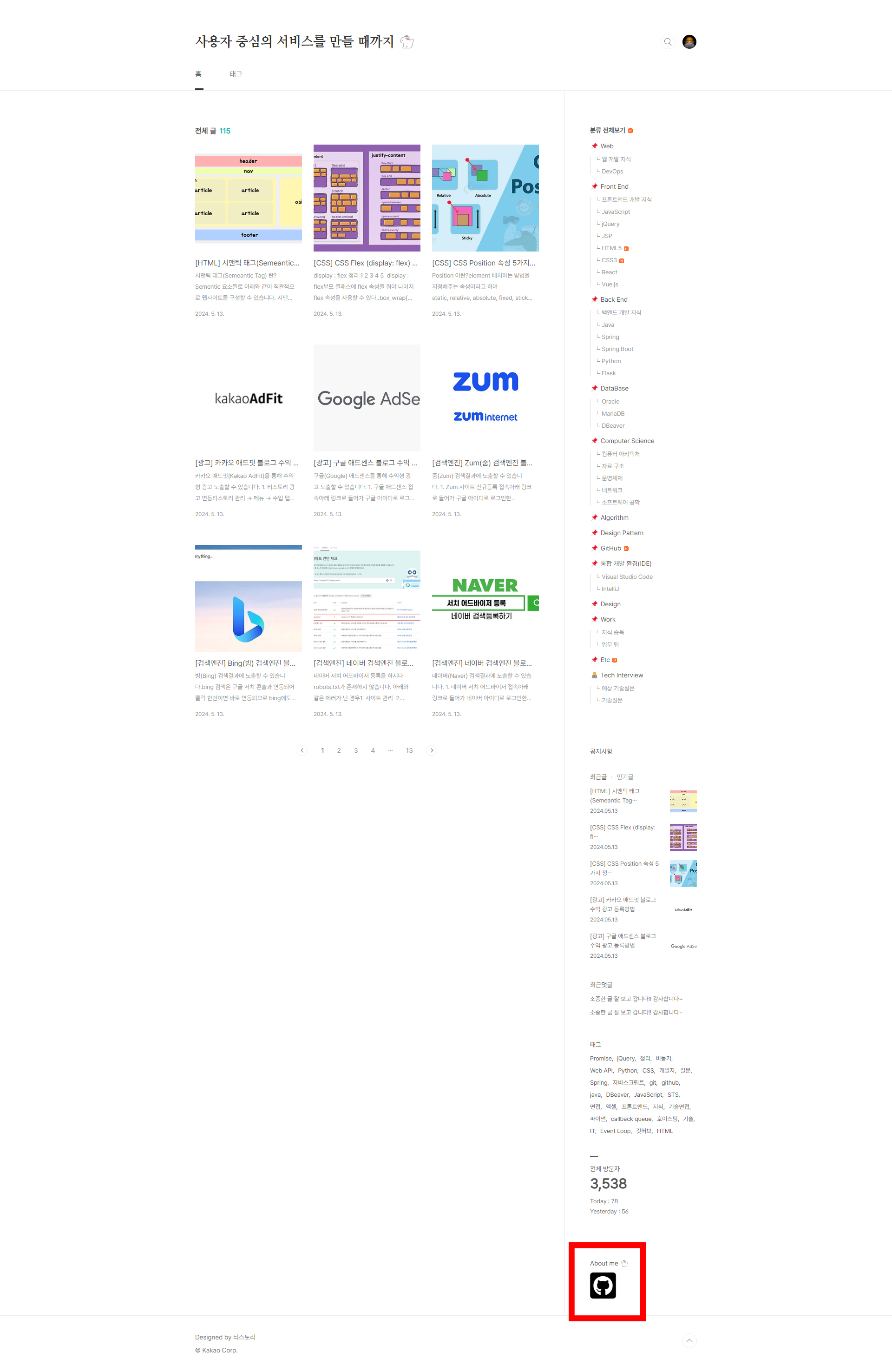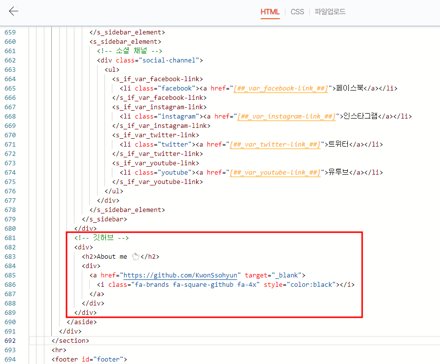 티스토리 블로그에 깃허브 아이콘을 적용 완료한 화면!