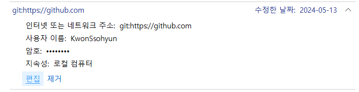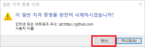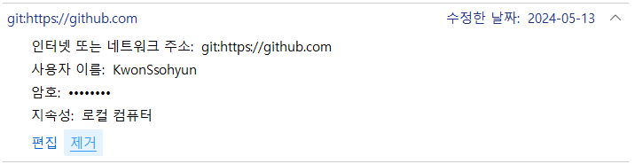 Windows 자격 증명을 선택하면 하단에 일반 자격 증명 리스트에 git 관련 내역이 보인다.
