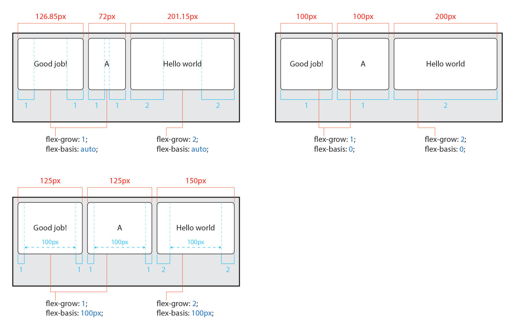 모든 Items의 총 증가 너비(flex-grow)에서 각 Item의 증가 너비의 비율 만큼 너비를 가질 수 있습니다.