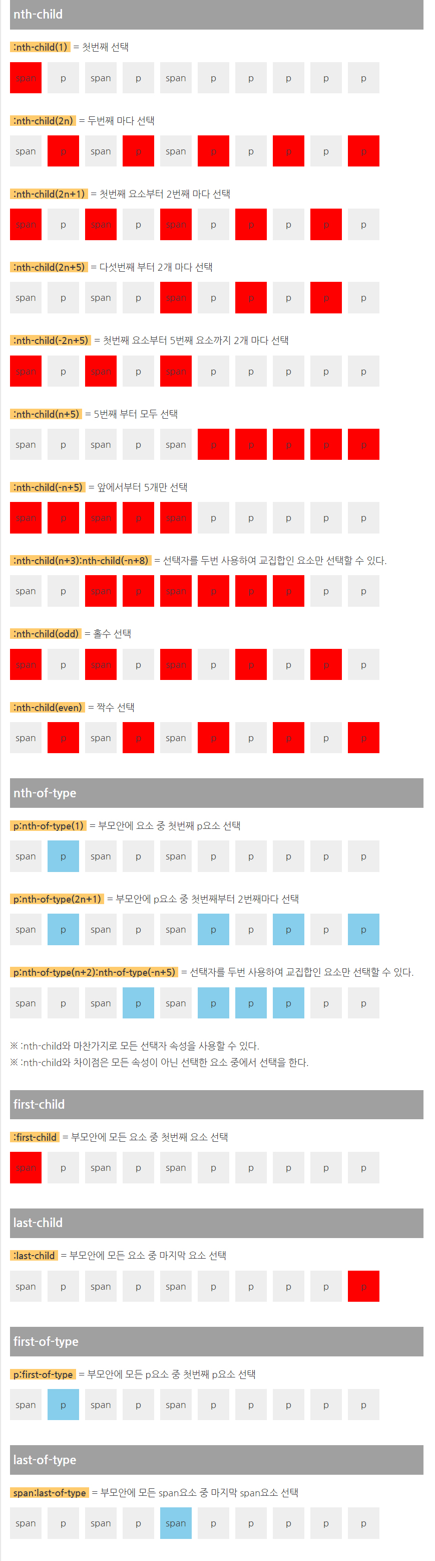 | first-of-type, last-of-type, nth-of-type(1), nth-last-of-type(1)과 동일합니다. | ||