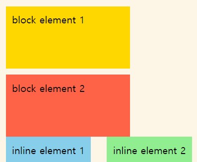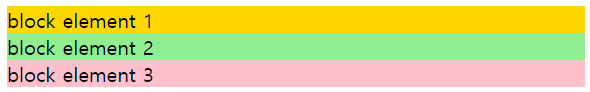 - 전체를 차지하기 때문에 각 요소들이 수직으로 쌓임 ( 한 줄에 한개만 배치 )