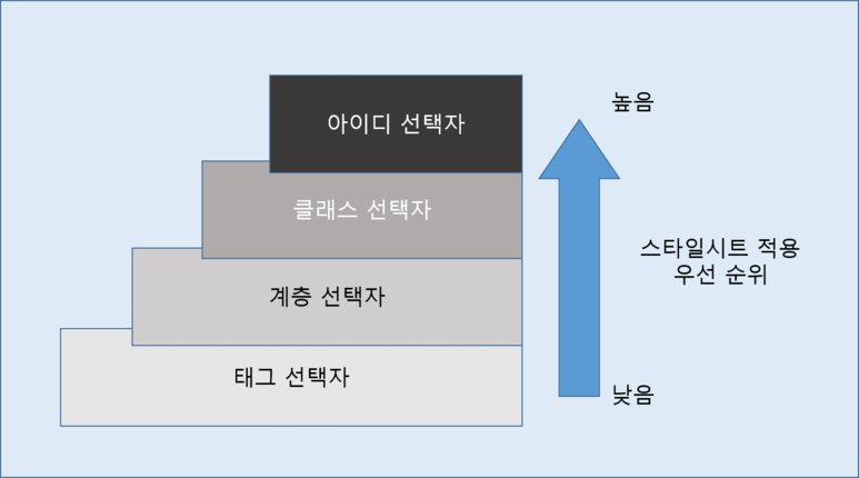 - 전체 선택자(*)는 우선순위가 가장 낮음