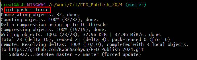커밋이 이미 원격에 푸시 되었다면 해당 명령어를 입력해 원격을 다시 덮어쓴다.
