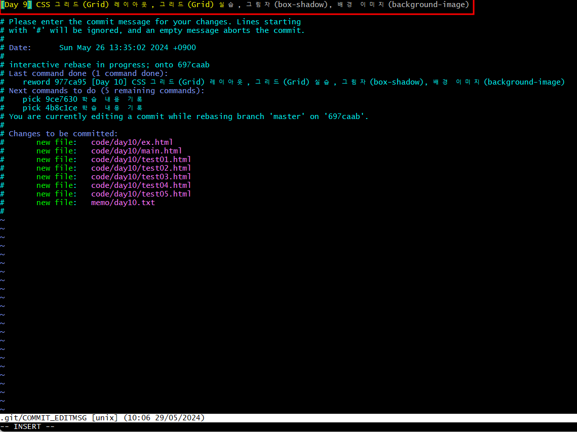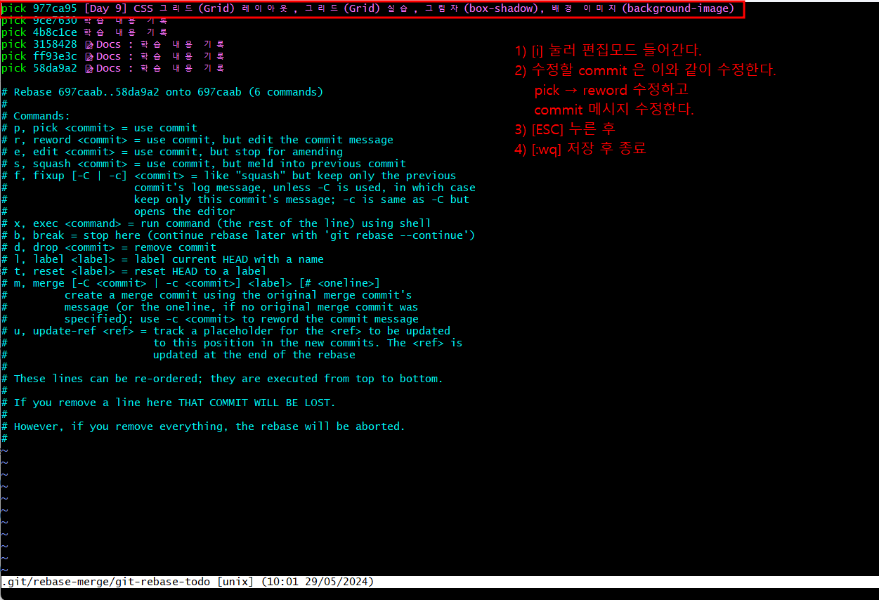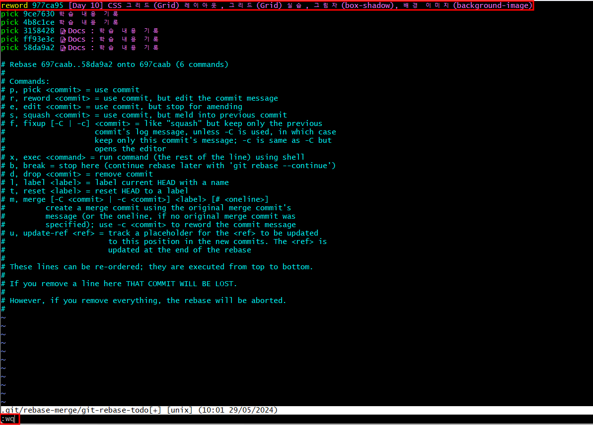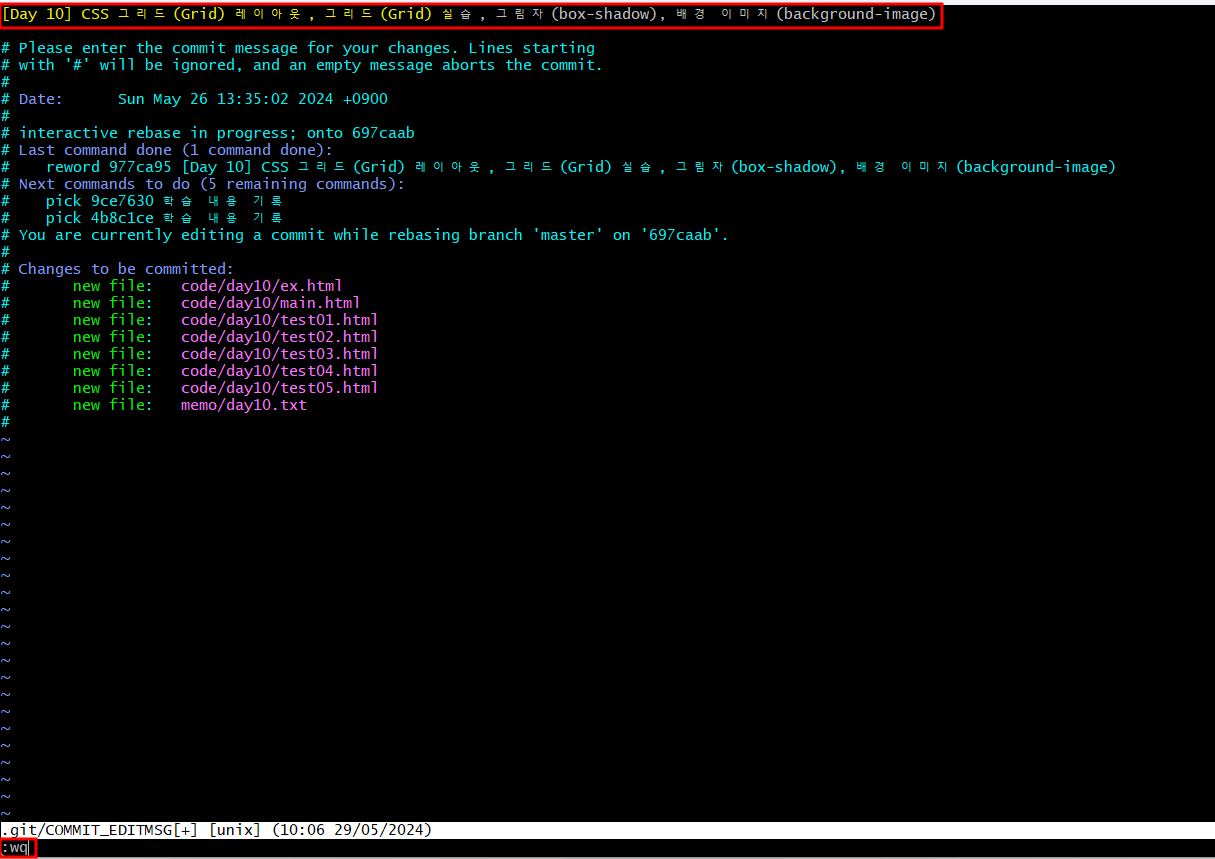 이때 아래와 같이 커밋 메시지를 수정하고 :wq로 저장하시면 됩니다.