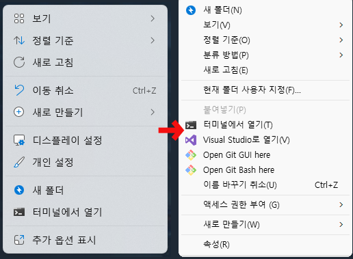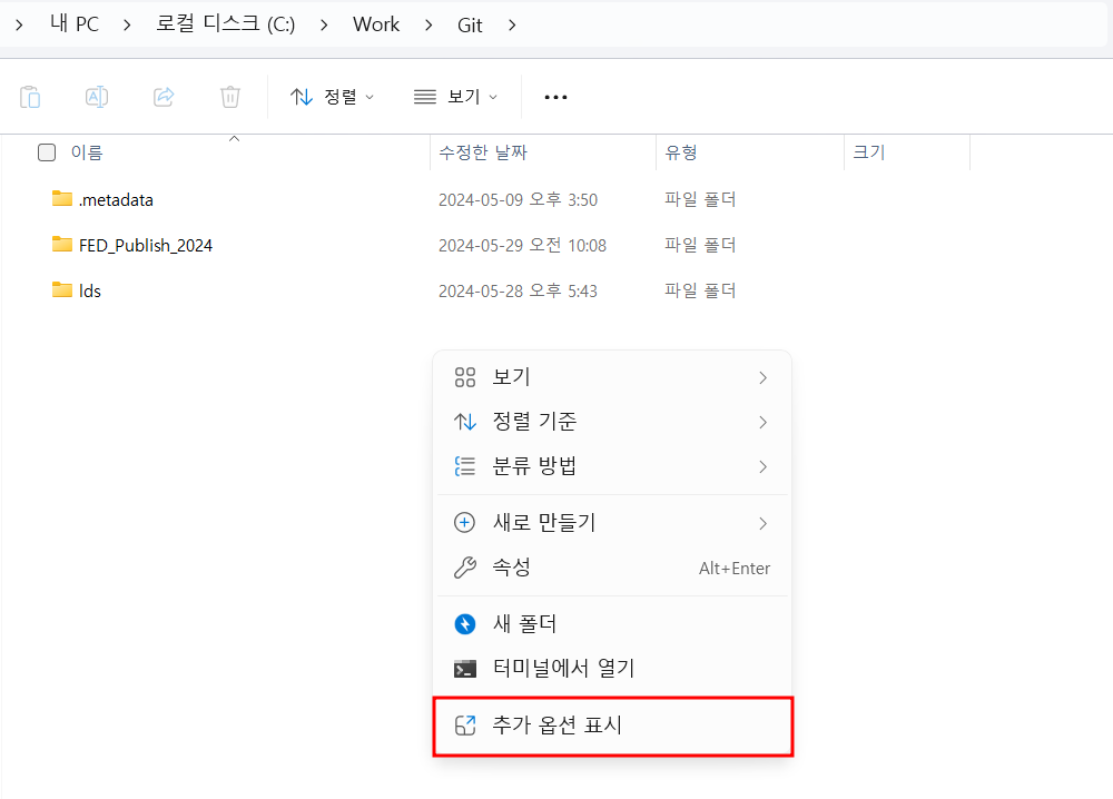 윈도우11 우클릭 메뉴를 열면 추가 옵션 표시를 한 번 더 클릭을 해야만