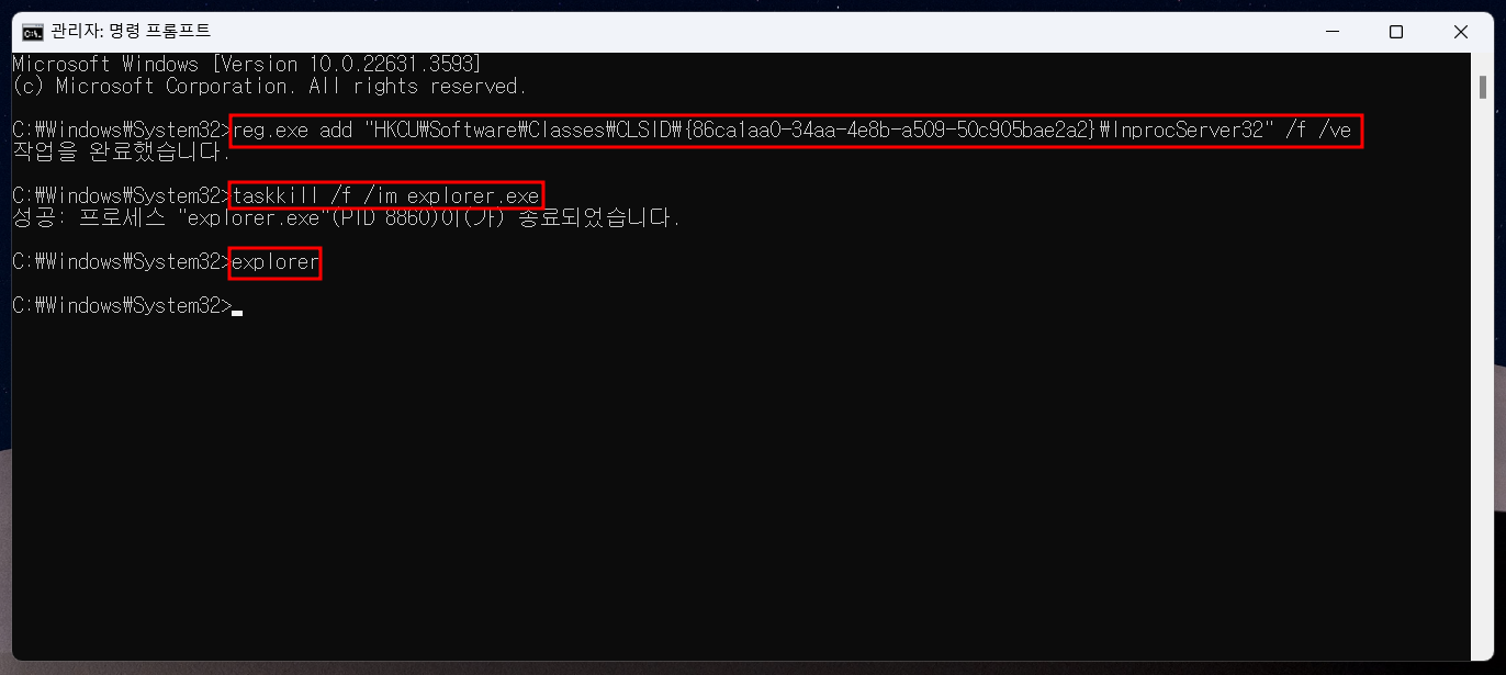 윈도우+Q ▶ cmd(명령프롬프트)를 "관리자 권한으로 실행" ▶ 아래 명령어 입력