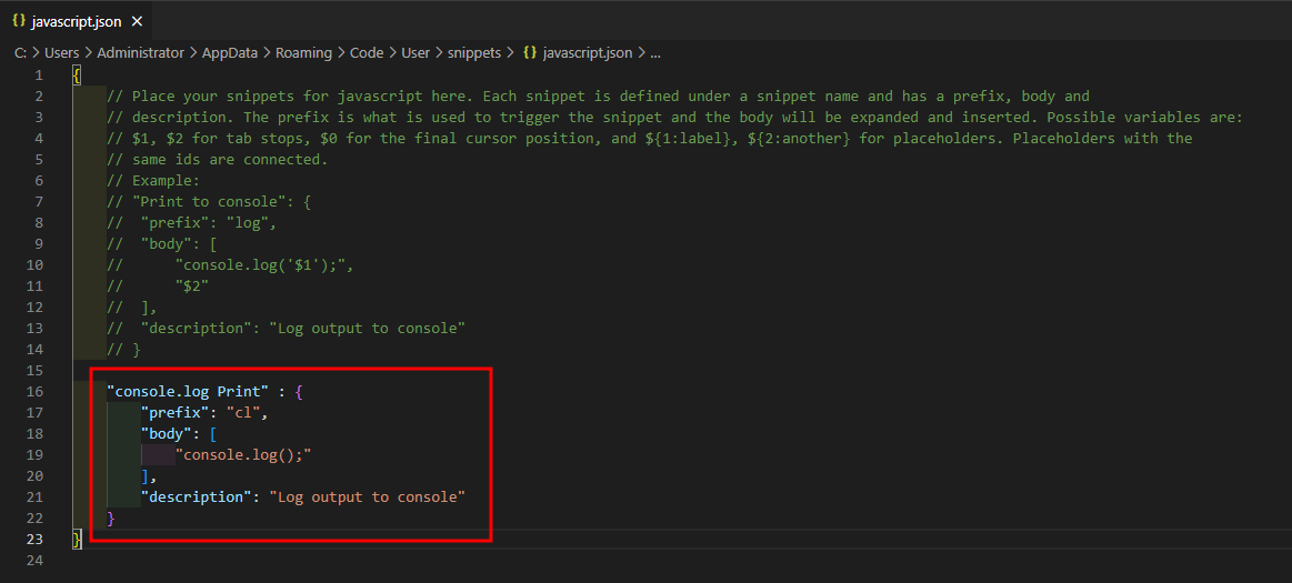 👉 File > Preference > Configure User Snippets