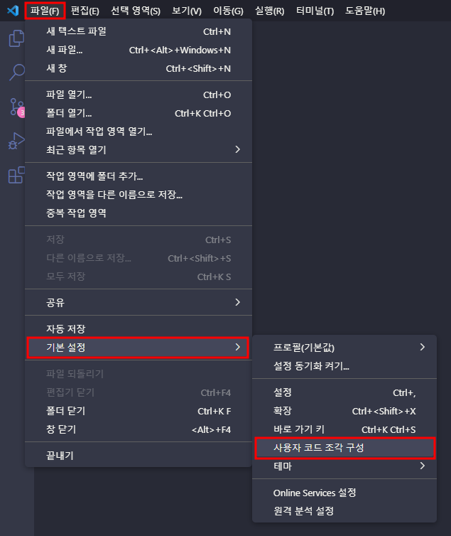 👉 파일 > 기본 설정 > 사용자 코드 조각 구성