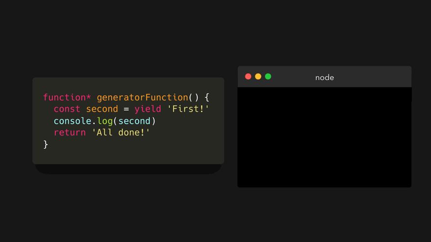 대신에 우리는 second라는 값을 할당하고, 문자열 First!를 산출합니다. 이는 우리가 next 메소드를 사용하면 먼저 산출될 값입니다.
