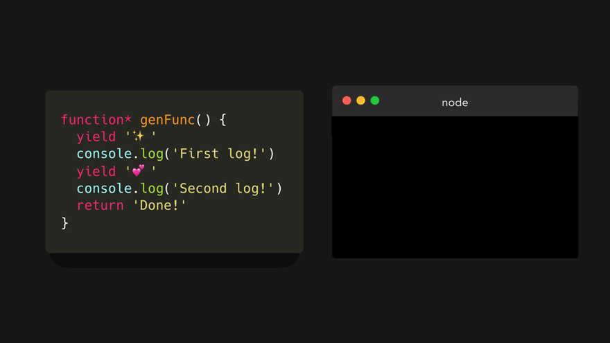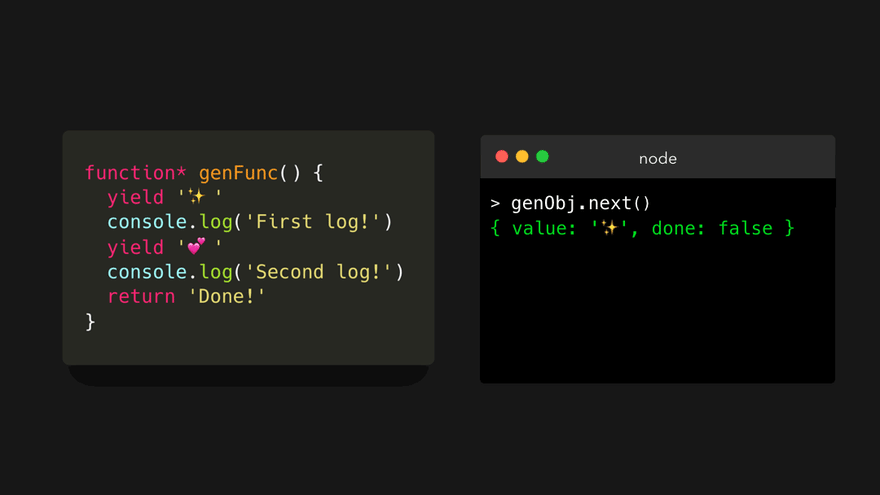- 먼저 처음 실행될 때, 첫번째 줄에서 "정지"하고 문자열 값 '✨'를 내보냅니다(yield).
