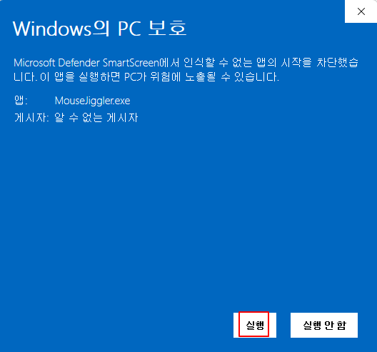 3. '실행' 버튼 클릭 ▶ mouse jiggler 실행
