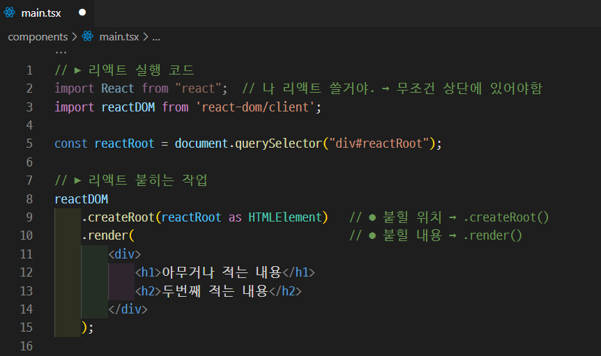 | .render(<div> ... </div>); | createRoot로 생성한 React 루트에 대해 render 메서드를 호출하여, React 컴포넌트를 지정된 DOM 요소에 렌더링합니다. 이 예제에서는 h1과 h2 태그를 포함하는 JSX를 렌더링합니다. |