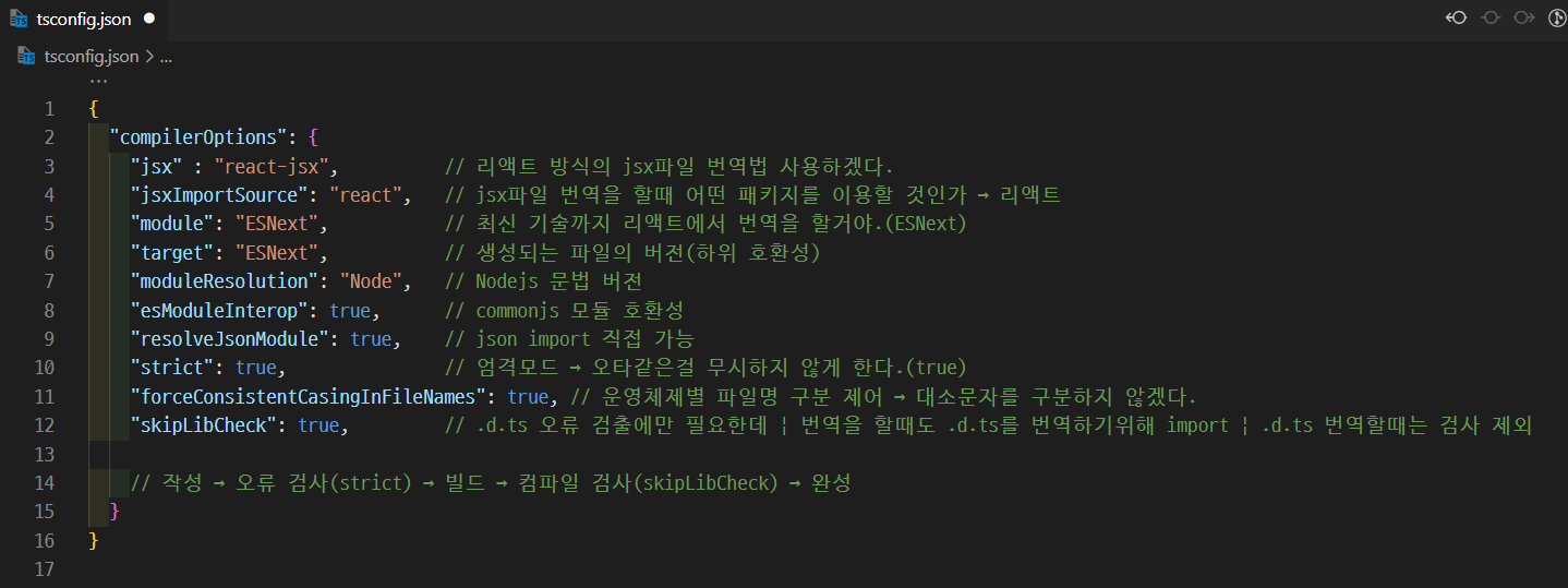 TypeScript 컴파일러의 설정을 정의합니다. (컴파일러는 코드를 다른 언어로 변환해 주는 프로그램)
