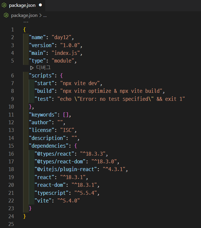 | "type": "module" | Node.js에서 ES 모듈을 사용하도록 설정합니다. 이 설정으로 import와 export를 사용할 수 있습니다. |