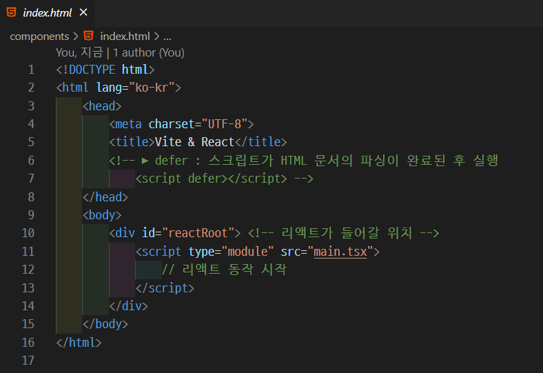 | 📜 index.html | React 애플리케이션이 렌더링될 HTML 파일을 생성합니다. 이 파일은 Vite가 서버를 시작할 때 기본적으로 제공하는 HTML 파일입니다. <div id="reactRoot"></div> React가 렌더링될 DOM 요소로 React의 진입점입니다. <script type="module" src="main.tsx"></script> main.tsx 파일을 불러와 React 애플리케이션이 동작하도록 합니다. |
