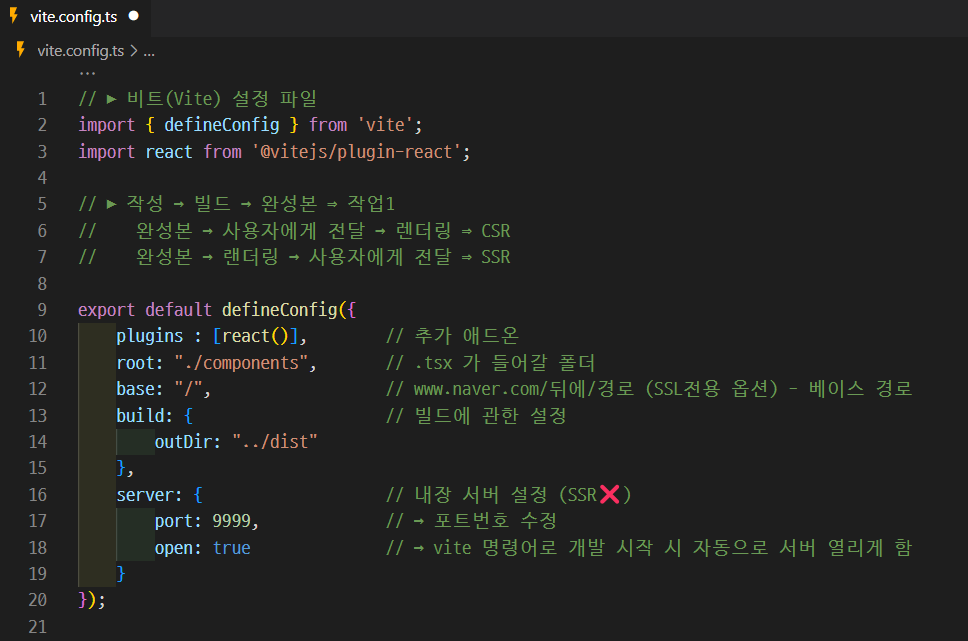 | export default defineConfig({ ... }); | Vite의 설정을 내보냅니다. defineConfig 함수를 사용하여 설정을 정의합니다. |