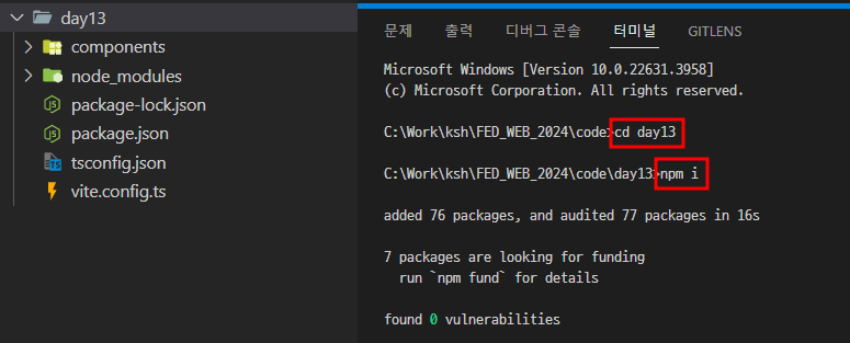- "npm i" 명령어 입력 ➡️ '📁node_modules' 폴더 / '📜package-lock.json' 파일 생성