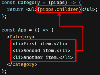 위 코드에서 <Category> 태그 안에 있는 <li> 태그들이 props.children으로 전달되고,