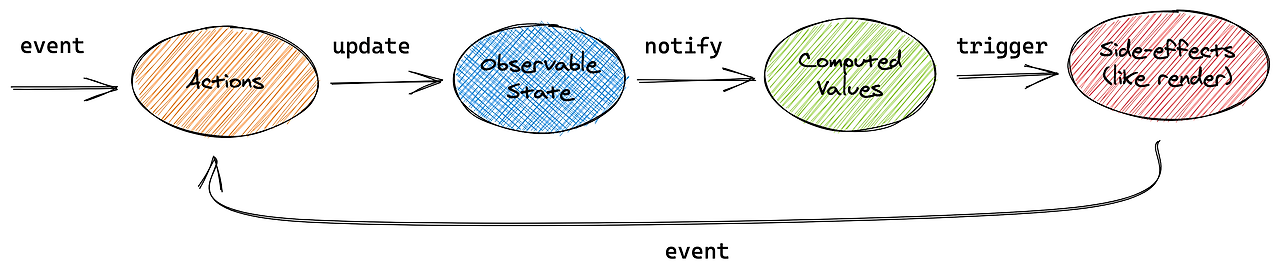 MobX에서의 상태 관리 과정은 다음과 같은 단계로 이루어집니다.
