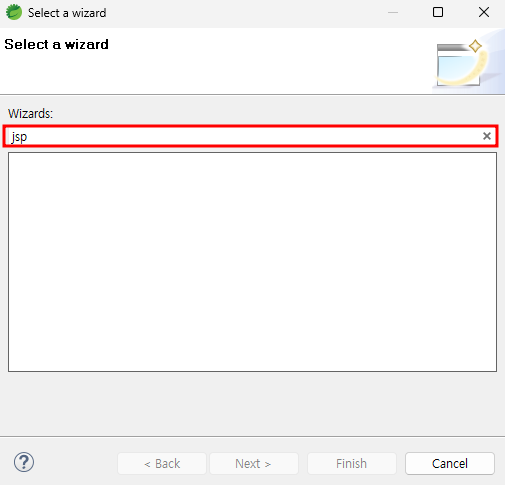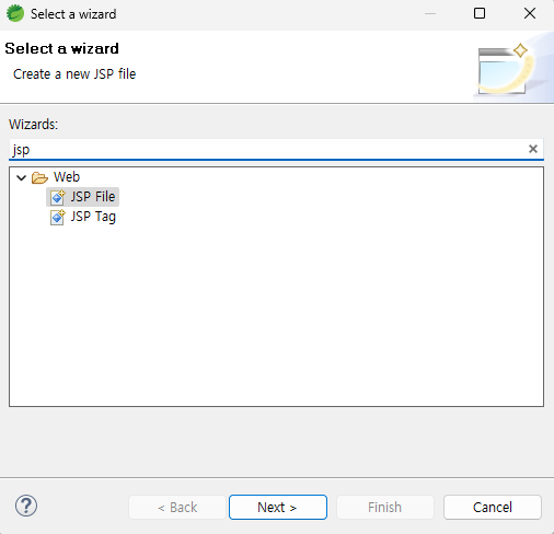 파일을 추가하는 기능인 "Select a Wizard"에서 JSP가 나타나지 않을 때가 있습니다.