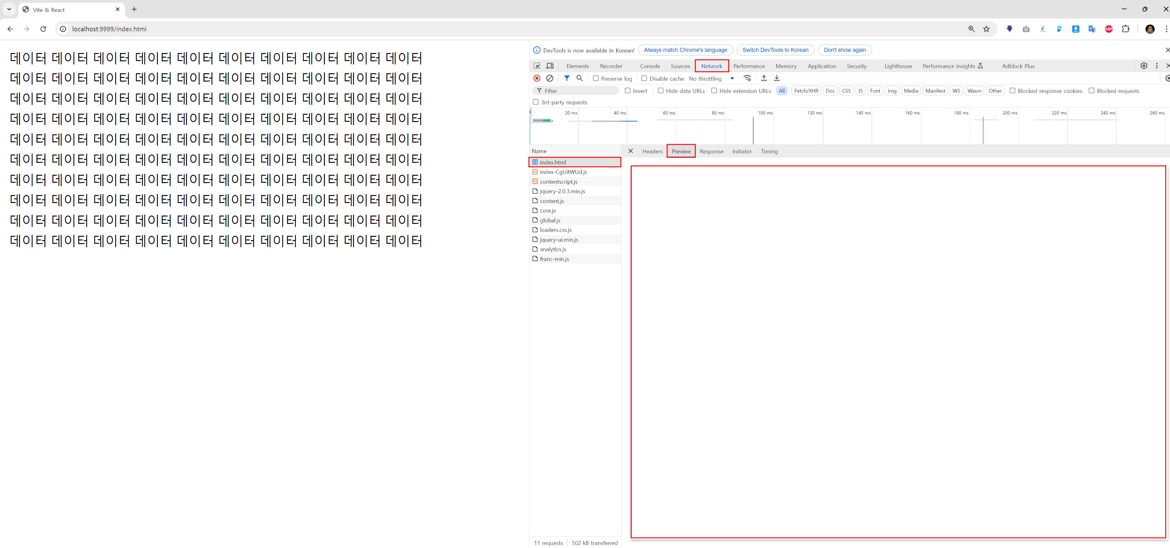 브라우저의 개발자 도구에서 'Network' 탭을 열고 'index.html'의 미리보기를 확인하면,