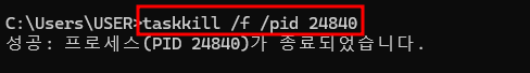 taskkill /f /pid 24840 입력하면 해당 8080포트 종료된다.