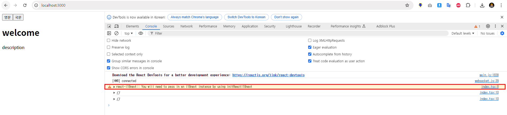 이로 인해 i18next 인스턴스가 초기화되지 않는다.