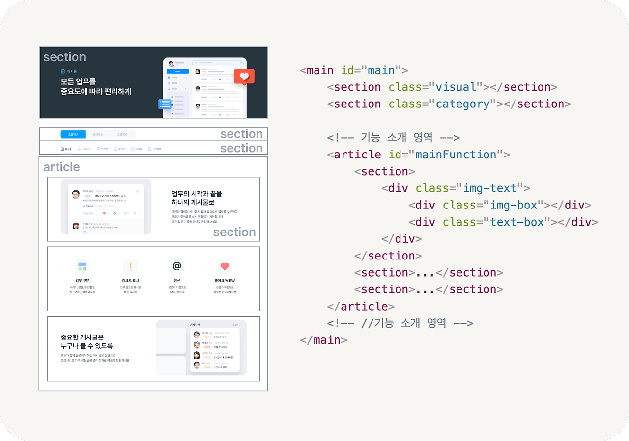 그 아래 기능 소개 영역은 <article>로 묶었습니다.