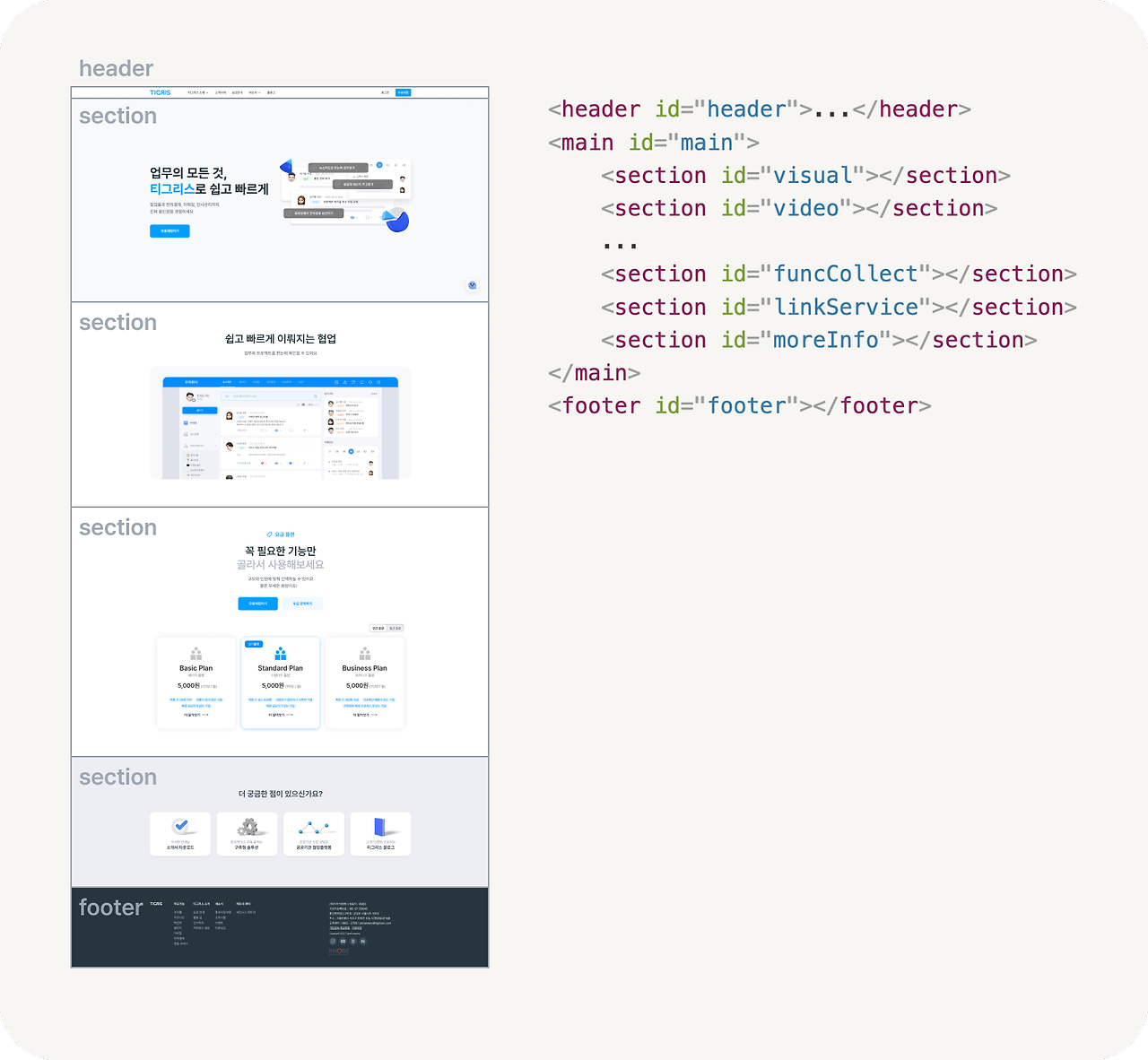 <header>, <main>, <footer>로 구성되며, <main> 안에 여러 <section>이 포함됩니다.