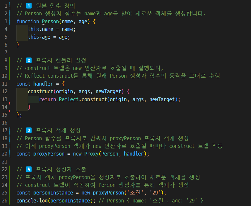 💡 construct 트랩에서는 Reflect.construct를 사용해야 올바르게 객체가 생성됩니다.