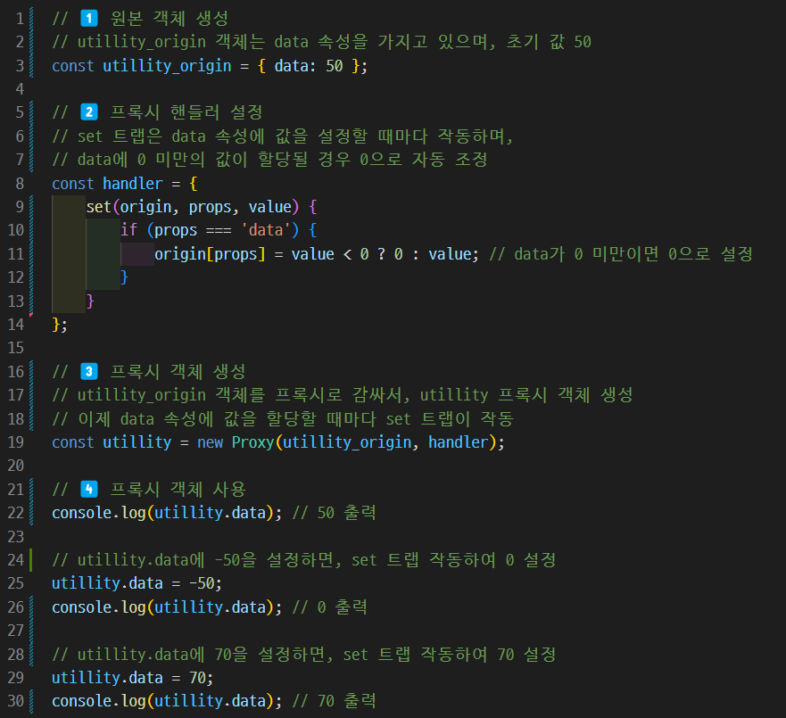 utillity_origin 객체의 data 속성을 프록시로 감싸서, data 값이 0 미만으로 설정되지 않도록 합니다.