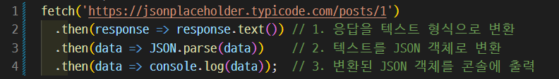 .then(data => JSON.parse(data)) // 2. 텍스트를 JSON 객체로 변환