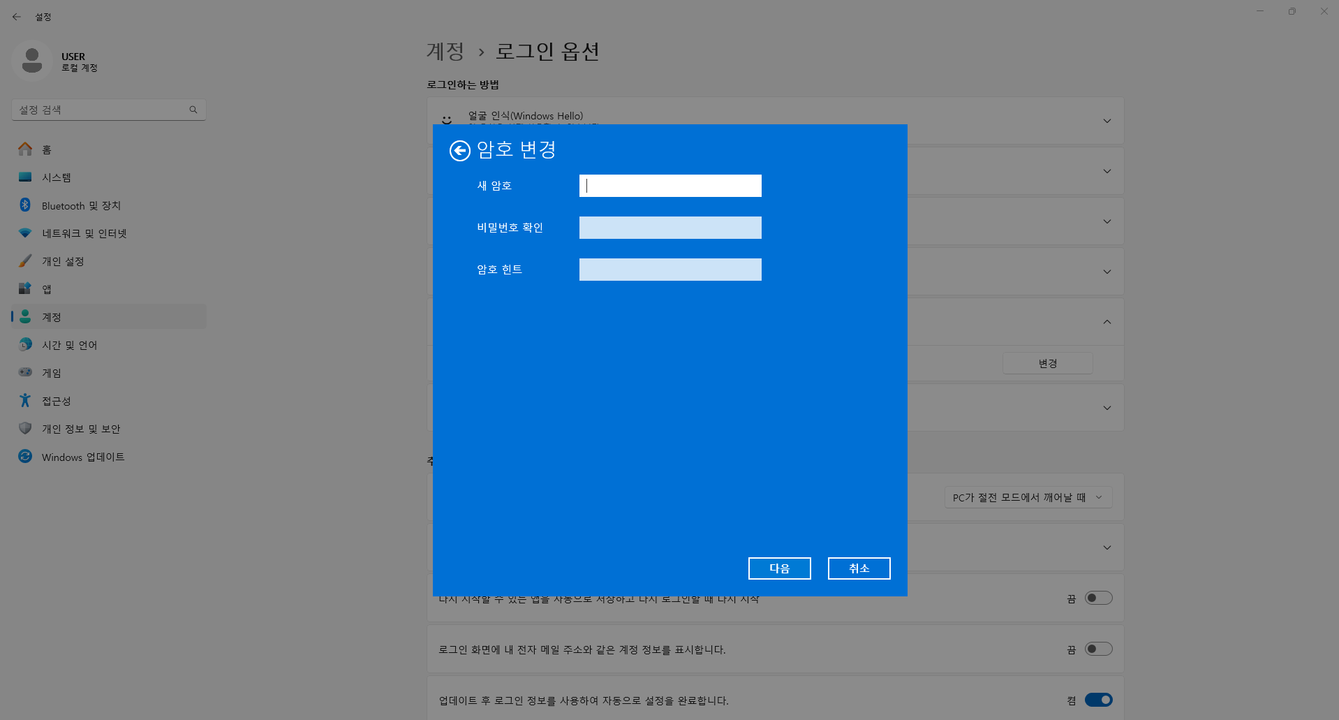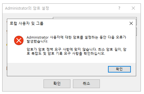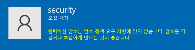 윈도우에서 사용자 계정 암호 설정 시 에러 메시지 발생합니다.