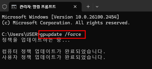 정책 변경 후에는 재부팅을 하거나 수동으로 정책을 업데이트 시켜줘야 합니다.